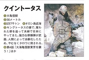 托塔斯王后,是在欧隆岛因为海底火山喷发而隆起时、从深埋了2亿年的远古龟蛋中诞生的雌性古代龟,由于来到了压力比地底弱的地面上,托塔斯王后和托塔斯王从高压中被解放,巨大化成为巨龟怪兽。托塔斯王后夫妇的性格都十分温顺,就近栖息在欧隆岛一带海域,其诞生在世界范围内都有一定的知名度。