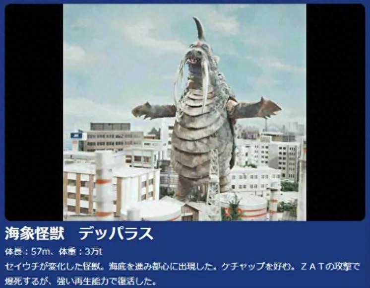 德帕拉斯,原本只是生活在北极海域一带的普通海象,由于突然变异而成为了怪兽。德帕拉斯在海底四处活动时,挖通了到达东京地底的通道,并从东京都内的河流中现身。德帕拉斯在市内横冲直撞,由于爱吃番茄酱还袭击了番茄酱工厂。
