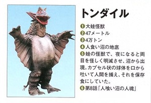 顿代尔是一种肉食性的大蛙怪兽,栖息在东京郊外、被人称为“食人沼泽”的沼泽地底,白天较少活动,在夜间就会浮出水面、伏击捕食路过的人类。由于夜间光线不足,加上顿代尔在水面上而且双目又散发出红光,因此常被其他的目击者认作是鬼火。