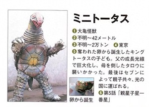 是托塔斯王和托塔斯王后所生的孩子,也是唯一孵化出生的小龟,被ZAT队的朝日奈队长命名为「小托塔斯」。在以蛋的形式出生时,就被黑崎等狩猎团从母亲托塔斯王后身边夺走,后来辗转被夺回,又被地球警备队攻击,小托塔斯的蛋被负伤的托塔斯王后含在嘴里护住,被带到东京。在凶暴化的托塔斯王后被泰罗·奥特曼打倒后,小托塔斯也从蛋里孵化,见到了死去的母亲,因此对泰罗有了强烈的敌意。