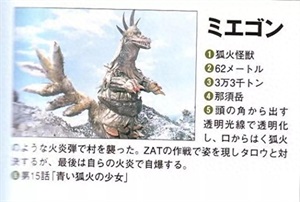 狐火怪兽米埃贡,栖息在流传着「九尾狐的传说」的栃木县·那须岳一带的怪兽,长相与九尾狐十分相似。米埃贡一直用狐火火炎弹袭击当地居民和观光设施,但由于米埃贡一直是隐身透明的状态,没什么人见过它的真实形貌,加上这一带自古就有的九尾狐传说,因此一直被当地居民所忌惮。