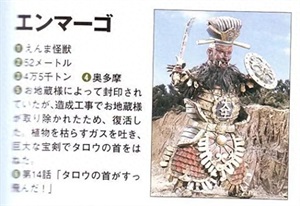 阎王怪兽恩马戈,在日本江户时代的奥多摩地带出现的、形似阎王的凶恶怪兽,造成奥多摩山地植物大量枯萎。直到后来,恩马戈被地藏菩萨封印在地下沉眠,封印上则安置了地藏菩萨像镇守,以保平安。这件事也一直在奥多摩一带居民中流传。