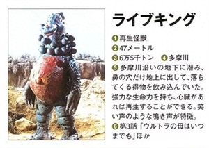 再生怪兽莱布王,在多摩川一带栖息生活的超能力怪兽,平时在多摩川地底休息,把鼻孔露在地面上进食,因此被附近的孩子们称作是「无论什么东西都能吃的奇怪的洞」,当成都市传说流传。在泰罗·奥特曼和液体大怪兽科斯莫利基德交战时,地底的莱布王将液体化的科斯莫利基德吞入腹中,但由于液体化的特性,莱布王一直无法消化科斯莫利基德,胃里十分难受,加上后来东光太郎又不慎被其吞入体内,再难忍受而冲出了地面。