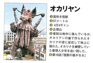 v笛声怪兽奥卡里扬,很早以前就在丘理山一带栖息的怪兽,那一口的大龅牙是其醒目特征。若干年前,少年亚理人的祖父为了制作陶笛,到丘理山中寻找材料,无意间得到了奥卡里扬掉落的牙齿,于是以此为材料制作陶笛。但奥卡里扬在听到自己的牙齿制作的陶笛发出的乐声后便出现,杀害了亚理人的祖父,陶笛则被亚理人的父亲当做遗物收藏。