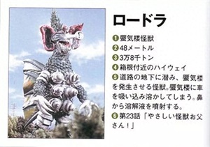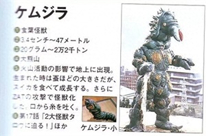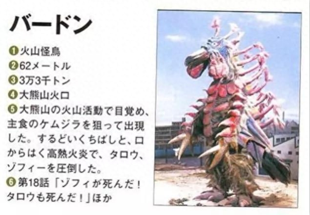 古代博物馆的文献有它的记录,随着火山活动影响而从休眠中苏醒,天敌是火山怪鸟巴顿,是火山怪鸟巴顿最喜欢吃的食物,口中能喷出毒丝,在和泰罗奥特曼的战斗中被巴顿袭击,最后被巴顿捕食。