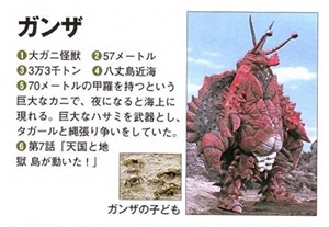 甘扎,是海中无数的小螃蟹由于某种原因的变异,聚集变化而成的大螃蟹怪兽,生活在八丈岛海域,在吃光了近海一带的鱼类后,甘扎又将目标转向了海上的船舶,在八丈岛东南方向300公里外的DS海域接连袭击了5艘轮船,并且全部吃掉。