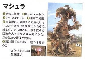 东京市中心突然的古代泥盆纪繁荣生长的巨型蘑菇,在被泰罗打倒后残存下来的小蘑菇寄生到武田大介身上,而后操纵大介进入水塔,吸收足够的水分后进化为马休拉,可以吐出名为蘑菇同化液的毒液,将人类变为蘑菇人,并从眼部发出光线控制着蘑菇人行动。