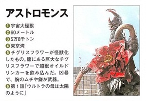 阿斯托罗姆斯,来自宇宙的超能力怪兽,以乔古里斯花种子的原型姿态,被东光太郎带到东京湾一带种植,几个小时内便开花并怪兽化发育完成。当食油超兽尤多林卡在夜间袭击东京湾时,阿斯托罗姆斯受到地面的刺激,也冲出了地表,击败并捕食了尤多林卡。由于受到ZAT的火力攻击,阿斯托罗姆斯选择暂时撤退,飞离现场。