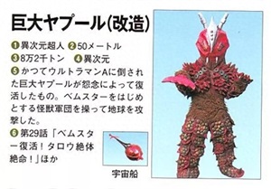 拥有不死身的怪兽,曾经在和泰罗的战斗中被斩首身亡,在体内再生细胞的作用下在一天之后再生,还从口中喷出火焰进行攻击。最终被降临地球的奥特之父消灭。