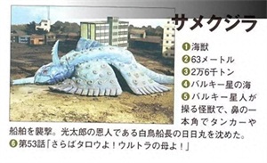 被巴尔基星人作为作为尖兵带到地球的水栖怪兽。使白鸟健一的父亲等多人乘坐的多数油轮沉没。鼻角非常锋利。和巴尔基星人一起夹攻泰罗,然后被泰罗的斯特利姆光线轻松击败。