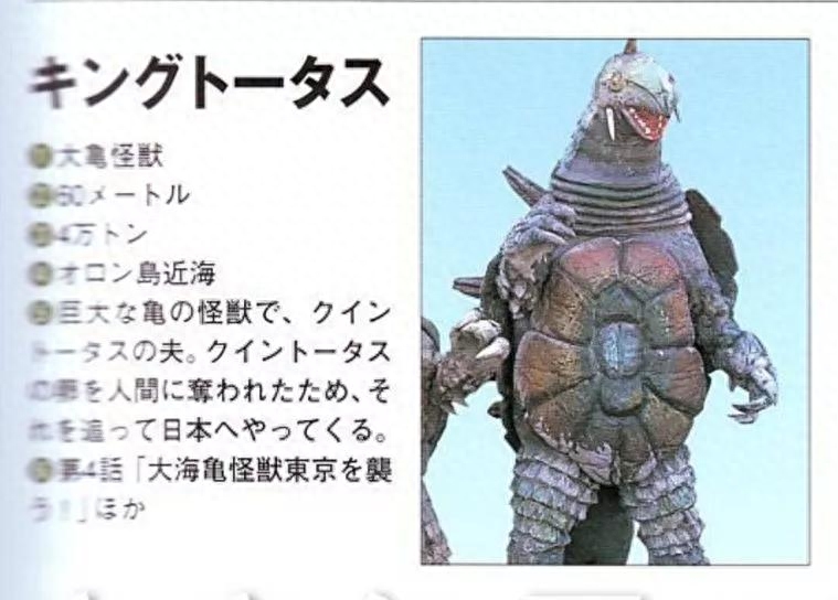 托塔斯王,是在欧隆岛因为海底火山喷发而隆起时、从深埋了2亿年的远古龟蛋中诞生的雄性古代龟,由于来到了压力比地底弱的地面上,托塔斯王和托塔斯王后从高压中被解放,一口气巨大化为巨龟怪兽。托塔斯王夫妇的性格都十分温顺,就近在欧隆岛一带海域栖息,其诞生在世界范围内都有一定的知名度。