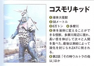 科斯莫利基德,在过去来到地球的宇宙怪兽,潜伏在多摩川一带,是一个肉食性的凶恶怪兽。科斯莫利基德在暴风雨之夜中现身于多摩川上游的施工现场附近,将工地的工人捕食殆尽后捣毁了工地,并继续以液体化能力隐藏在多摩川中。翌日,科斯莫利基德活动时被赶来调查的东光太郎发现并被炮弹打中,于是立刻液化遁逃,来到多摩川下游袭击了钓鱼客,随后就地隐藏。