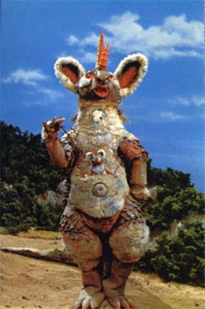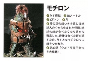 传说在月亮上有兔子舂年糕,于是向月亮供奉团子,人们的心情传到月亮上,形成的怪兽。木臼状的脸上附有手足,能说话,口吐高温火焰,同时还有将四肢和头顶尾巴收入身体中冲击破坏的「臼车」作为武器,最后与南夕子和奥特之父回到月球。