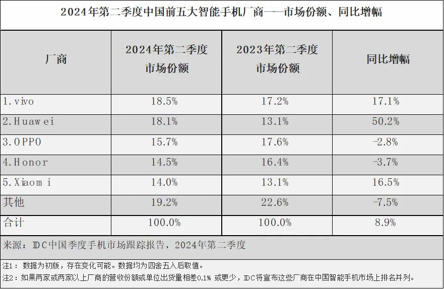 具体到市场份额上,根据 IDC 数据,中国市场前五名分别是 vivo(18.5%)、华为(18.1%)、OPPO(15.7%)、荣耀(14.5%)、小米(14.0%)。