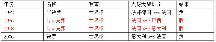 △ 法国队世界杯淘汰赛阶段经历过4次点球大战,取得2胜2负,1982年7-8联邦德国(点球4-5),1986年5-4巴西(点球4-3),1998年4-3意大利(点球4-3),2006年4-6意大利(点球3-5)。