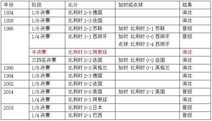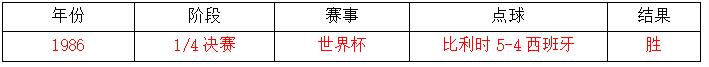 △ 比利时队世界杯历史上共参加过1场半决赛,1986年0-2负于阿根廷被淘汰。