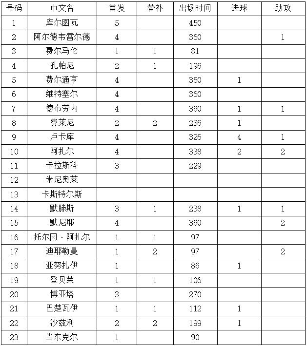 △ 比利时队前5场共被射门69次,其中对手通过中路配合完成射门13次、边路传中完成射门23次、个人能力完成射门18次、利用定位球完成射门15次。