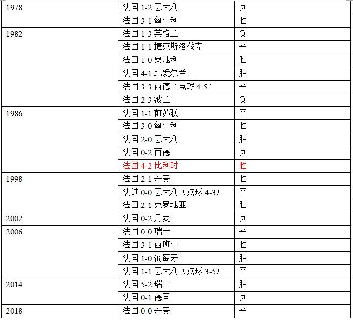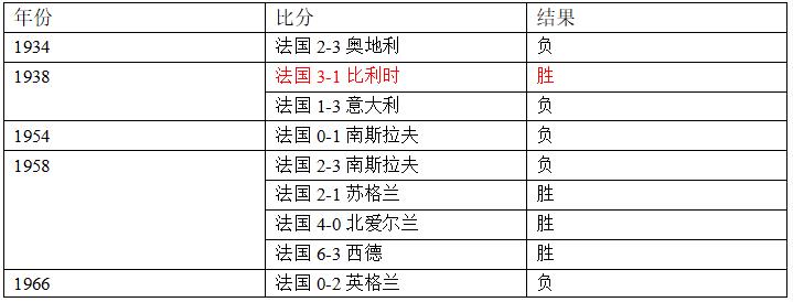 △ 法国队世界杯中最近7次对阵欧洲球队取得3胜3平1负。