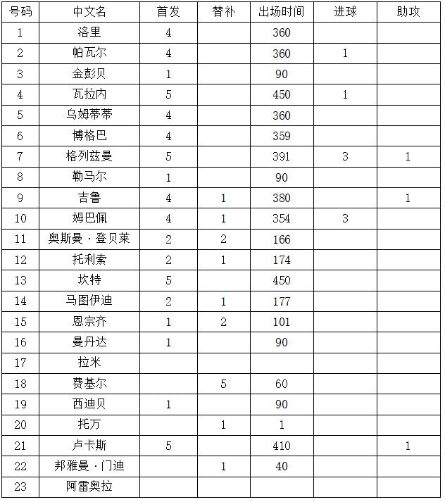 △ 法国队前5场共射门56次,其中中路配合完成射门13次、边路传中完成射门14次、长传冲吊完成射门1次、利用个人能力完成射门13次、利用定位球完成射门14次、利用对手失误完成射门1次。