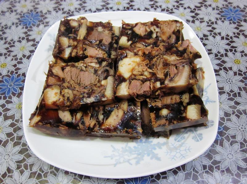 老屋里的大铁锅装上大半锅水,放上一些诸如八角,桂皮之类的大料,把事先用沥青浇过祛除了毛发的猪头放进去,用干树枝,豆秸一些硬火一直煮,煮到快熟时母亲会用镊子把之前没除干净的猪毛一根根的拔干净。然后加入一些酱油等调料,边煮边把里面的沫沫撇出来,直到骨头可以取出来,肉快煮烂为止。最后快出锅时候,放上点大葱段,把所有一锅煮好的肉汤放入事先擦干净的盆子里冷却,结成一块时就可以切片或者块享用了。来客人时切一块,配上花生米,做下酒菜,一般准备吃多少就切多少,剩下的在没有冰箱的情况下至少可以保留到过年不变质。