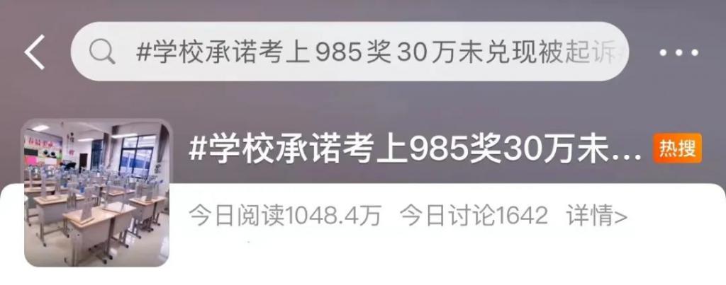 6 月 29 日,话题 # 学校承诺考上 985 奖 30 万未兑现被起诉 # 登上微博热搜,引发关注。