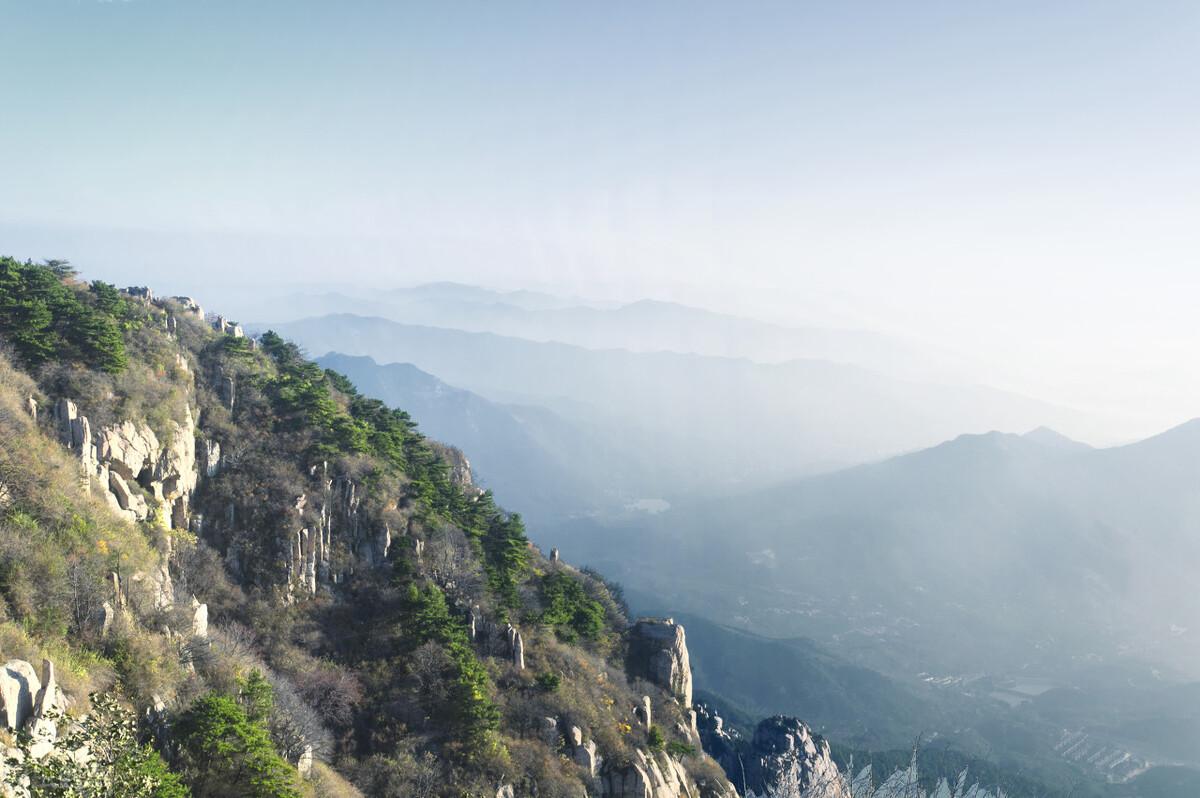 泰山的山体雄伟高大,主峰海拔高达1545米,山脉绵延数十里,身处泰山脚下观望泰山给人一种稳定厚重的感觉。山峰不但高而且山势陡峭,宛如一根屹立天地的石柱,这种优势是其他山峰无法比拟的。