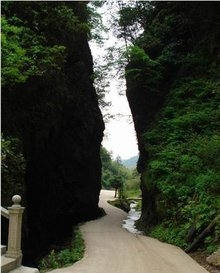 林绝壁、云锁幽谷 最妙景观有:龙潭瀑布落差10余米,如白练悬壁,溅起白莲朵朵,潭面有天然石联成三维桥;两石山并立,狭缝仅4米,形成“一线天”,浅溪穿峡流过,风和日暖时数百彩蝶翩翩起舞;龙头坎石壁高耸入云,谷底深潭波光粼粼;三级瀑布和连环石鸡凼,如观音洒水终年不枯。景区内有马羚羊、穿山甲、斑狗、娃娃鱼、夹板龟等稀有动物,富产鲜笋、银杏、香菇、薇菜。