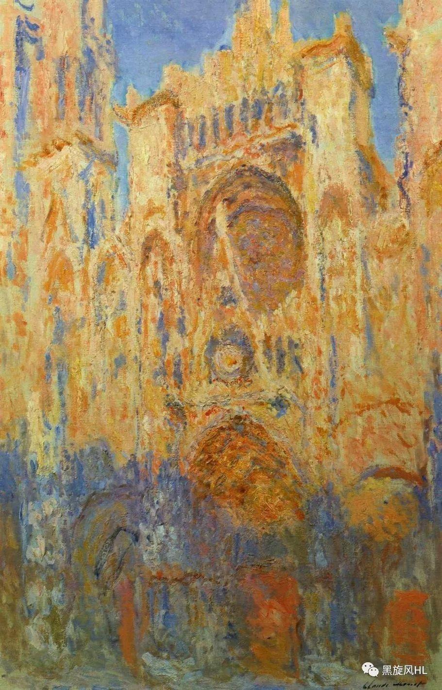 《鲁昂教堂》是莫奈的又一组系列画作,他长达两年连续观察日升日落过程中教堂的光线变化,他不会逼真地描绘教堂的雄伟壮观,因为那已是摄影师干的事了,他要表现的只有光,在光的世界里,干草堆和教堂并没有什么两样。