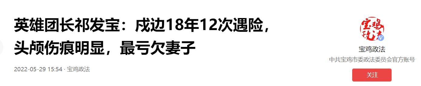 宝鸡政法在2025-05-29关于《英雄团长祁发宝:戍边18年12次遇险,头颅伤痕明显,最亏欠妻子》的报道