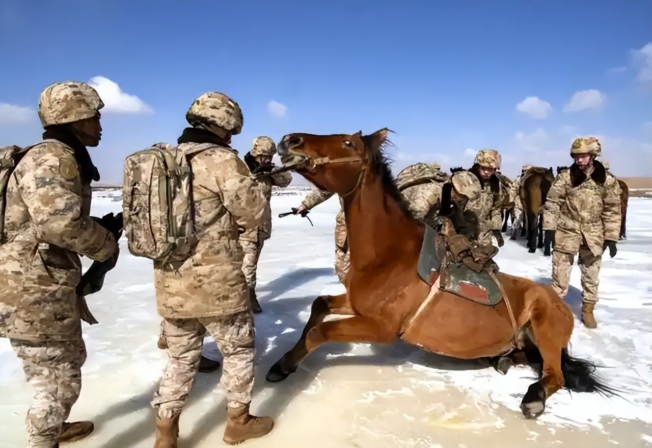 一匹军马突失前蹄,瞬间坠落悬崖,被汹涌的象泉河河水吞噬。