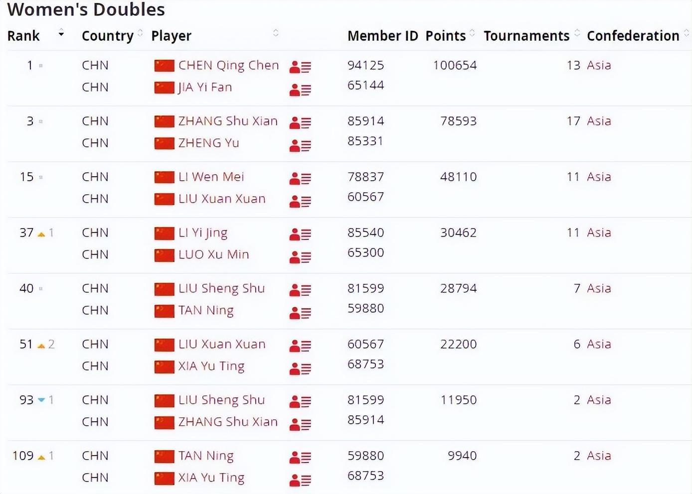 女双世界排名前十无变化,陈清晨/贾一凡仍居榜首,小将们的排名有了部分提升,其中,上周夺得中国国际挑战赛亚军的坑姝良/张弛上升57位至第124,李怡婧/罗徐敏上升1位至第37,刘玄炫/夏玉婷上升2位至第51,谭宁/夏玉婷上升1位至第109。