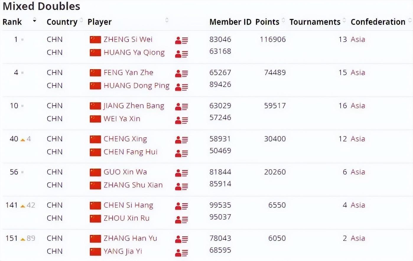 混双世界排名前十无变化,郑思维/黄雅琼依然排名第一。上周夺得中国国际挑战赛冠军的程星/陈芳卉上升4位至第40,郭新娃/张殊贤第56,陈思航/周芯如上升42位至第141、章涵宇/杨嘉怡上升89位至第151。