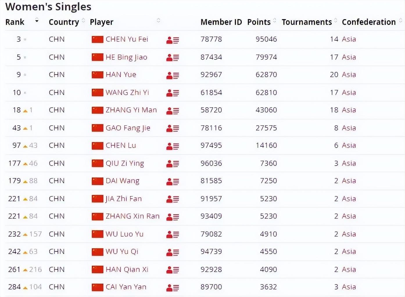 女单方面,陈雨菲依旧排名第3,何冰娇、韩悦和王祉怡居第5、9、10位。张艺曼上升1位分别至第18,高昉洁上升1位至第43,上周夺得中国国际挑战赛冠亚军的两位小将名次有了很大提升,其中,冠军陈鲁上升43位至第97、亚军戴望上升88位至第179,此外,裘子莹上升46位至第177,蔡炎炎上升104位至第284。