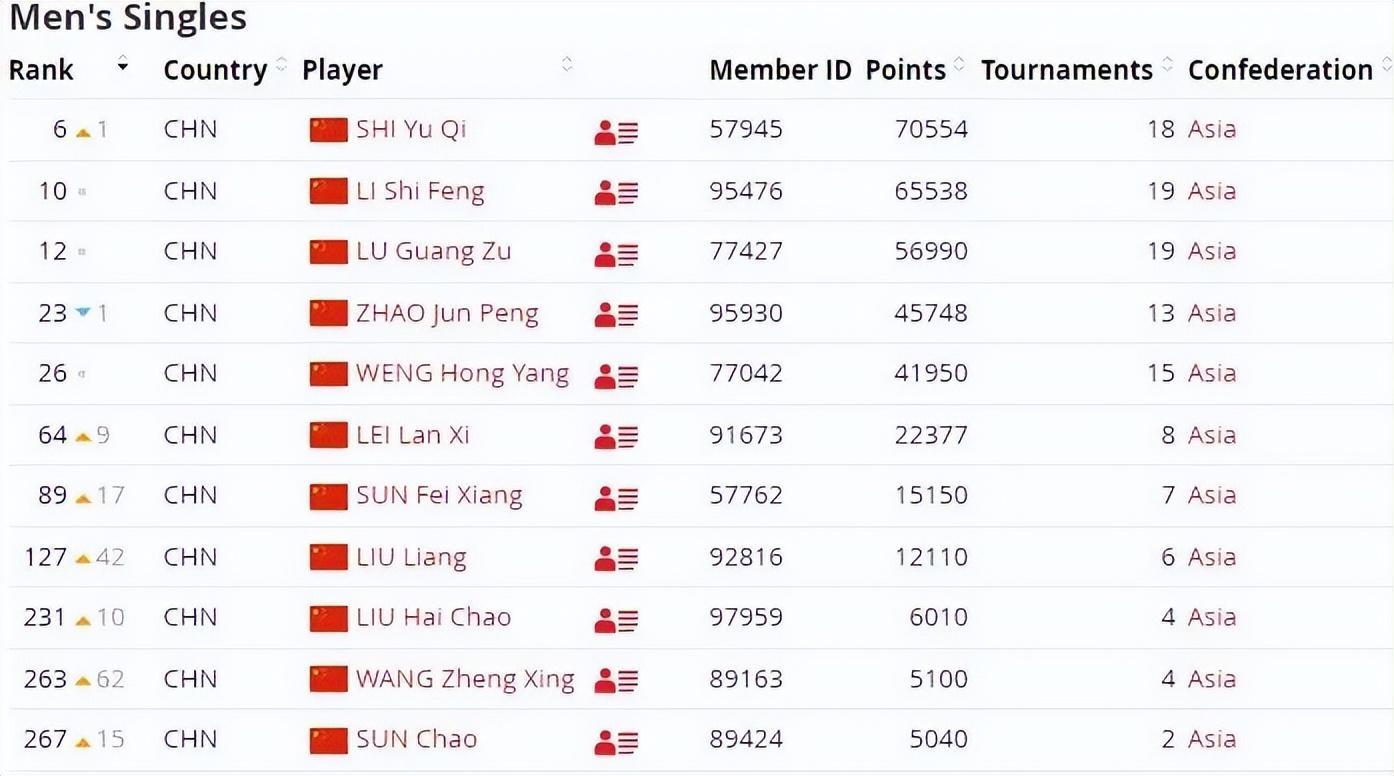 男单方面,前十的世界排名中,石宇奇上升1位至第6,李诗沣仍居第10。赵俊鹏下滑1位至第23。上周夺得中国国际挑战赛冠军的雷兰曦上升9位至第64,亚军刘亮上升42位至第127。此外,孙飞翔上升17位至第89,刘海超上升10位至第231,王正行上升62位至第263,孙超上升15位至第267。