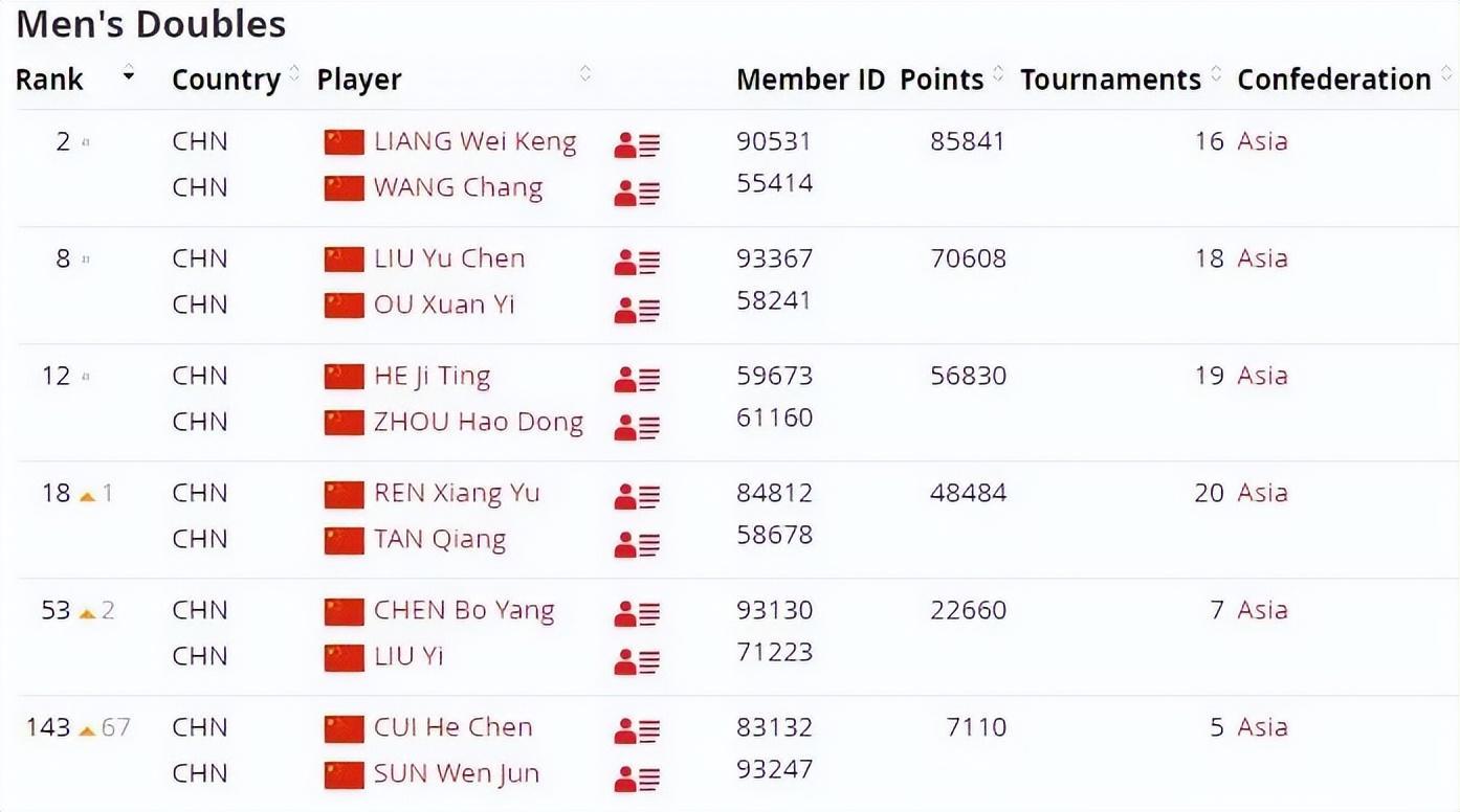 男双世界排名前十无变化,梁伟铿/王昶、刘雨辰/欧烜屹仍居第二和第八位。另外,任翔宇/谭强上升1位至第18、陈柏阳/刘毅上升2位至第53。最大变化是小将崔赫宸/孙文骏,上升67位至第143。