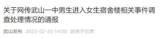 2 月 20 日 14 时,武山县联合调查组发布通报称,2 月 18 日,网传武山一中男生进入女生宿舍楼相关事件发生后,县委、县政府高度重视,及时责成县公安局、县教育局、武山一中组成工作组,对该事件开展深入调查处置。现将调查处理情况通报如下: