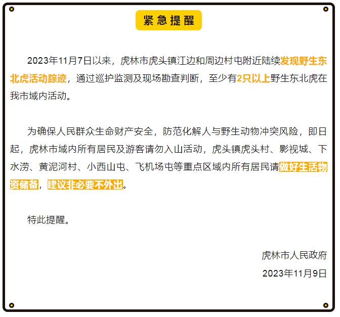 为确保人民群众生命财产安全,防范化解人与野生动物冲突风险,即日起,虎林市域内所有居民及游客请勿入山活动,虎头镇虎头村、影视城、下水涝、黄泥河村、小西山屯、飞机场屯等重点区域内所有居民请做好生活物资储备,建议非必要不外出。