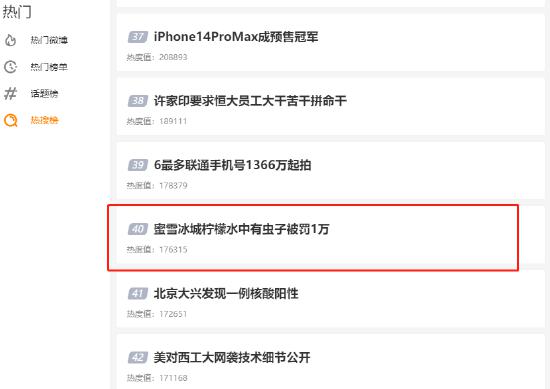 13 日下午,蜜雪冰城柠檬水中有虫子被罚 1 万冲上微博热搜。
