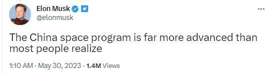 随后,马斯克在该推文下面评论道," 中国的航天工程计划,比大多数人意识到的要更加超前。"