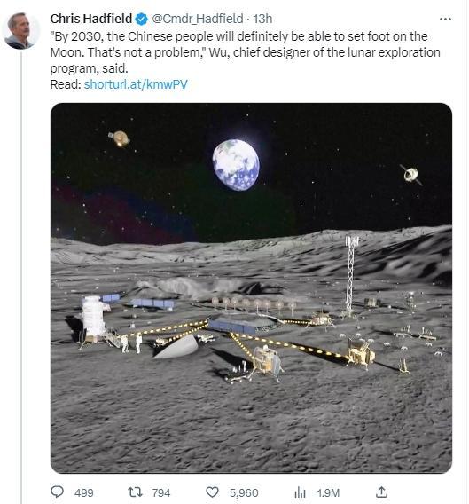加拿大航天局前宇航员克里斯 · 哈德菲尔德在社交媒体推特上转发了 CGTN 的一篇报道,他写道," 中国探月工程总设计师吴伟仁说,‘到 2030 年,中国人的足迹一定能够踏上月球。这不是个问题。’ "