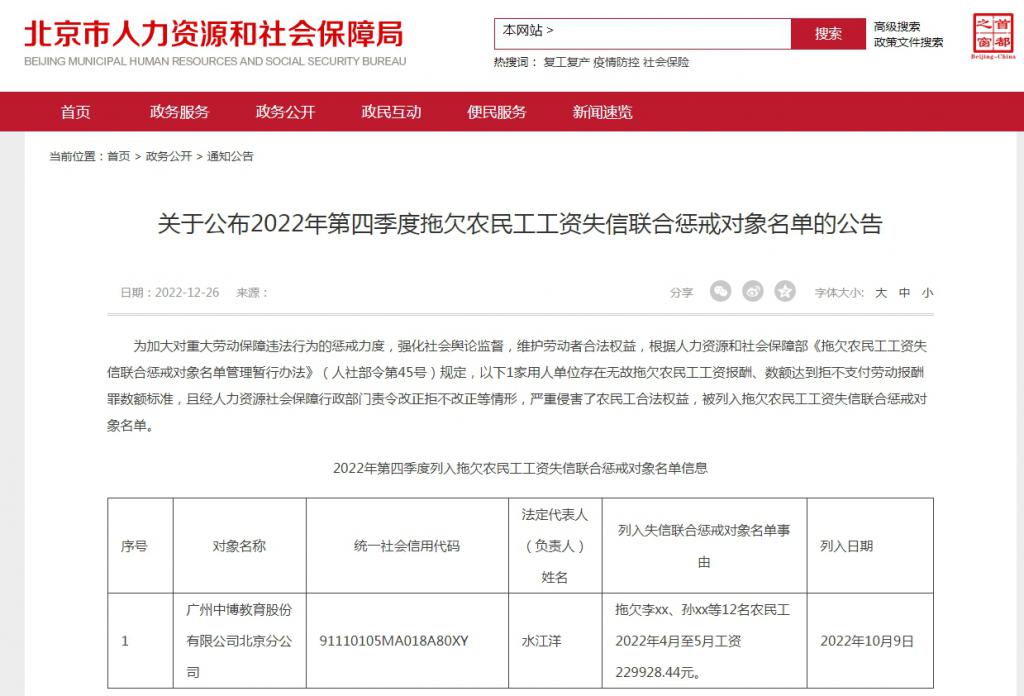 公告指出,广州中博教育股份有限公司北京分公司存在无故拖欠农民工工资报酬、数额达到拒不支付劳动报酬罪数额标准,且经人力资源社会保障行政部门责令改正拒不改正等情形,严重侵害了农民工合法权益,被列入拖欠农民工工资失信联合惩戒对象名单。