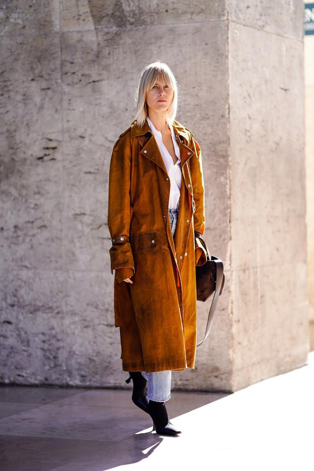 因为鹿皮绒的垂感很好,选择中长款的外套版型更端庄,具有偏中性风的帅气,简洁的线条也能够很好的修饰身材。