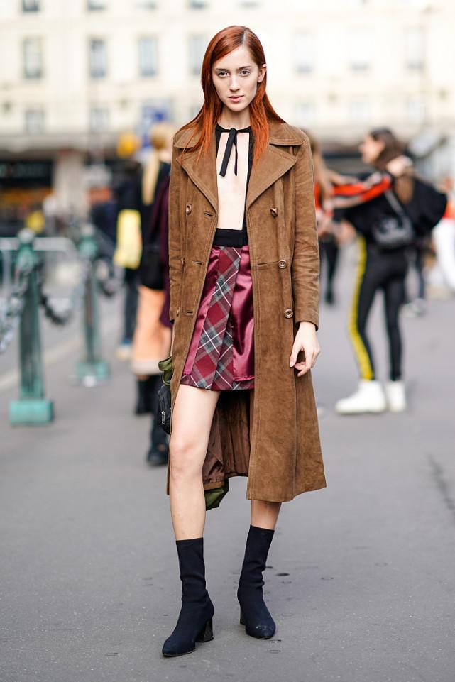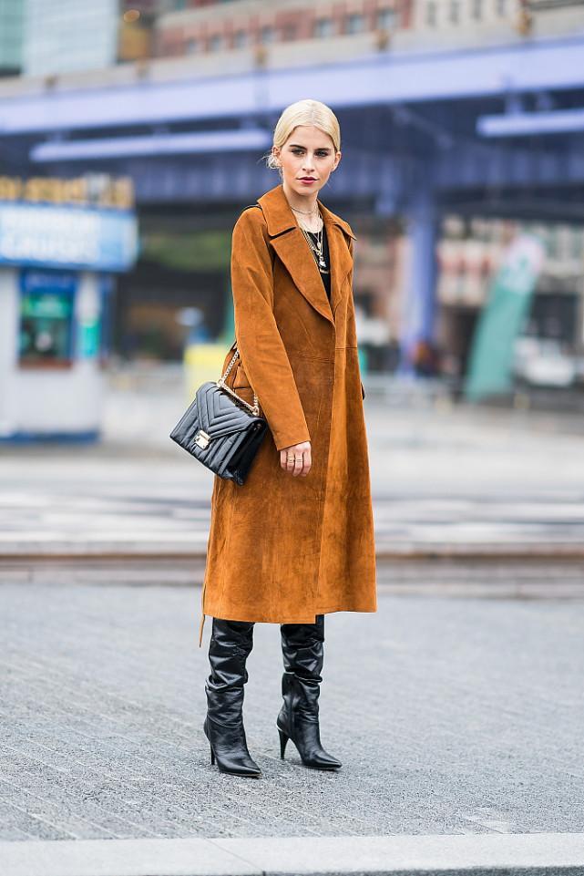 因为鹿皮绒的气场大多都比较的华丽大气,所以搭配长筒靴会比搭配短靴更加有魄力。长筒靴同时还会略带一分性感,让鹿皮绒这种稳重的服装更加的时尚吸睛。