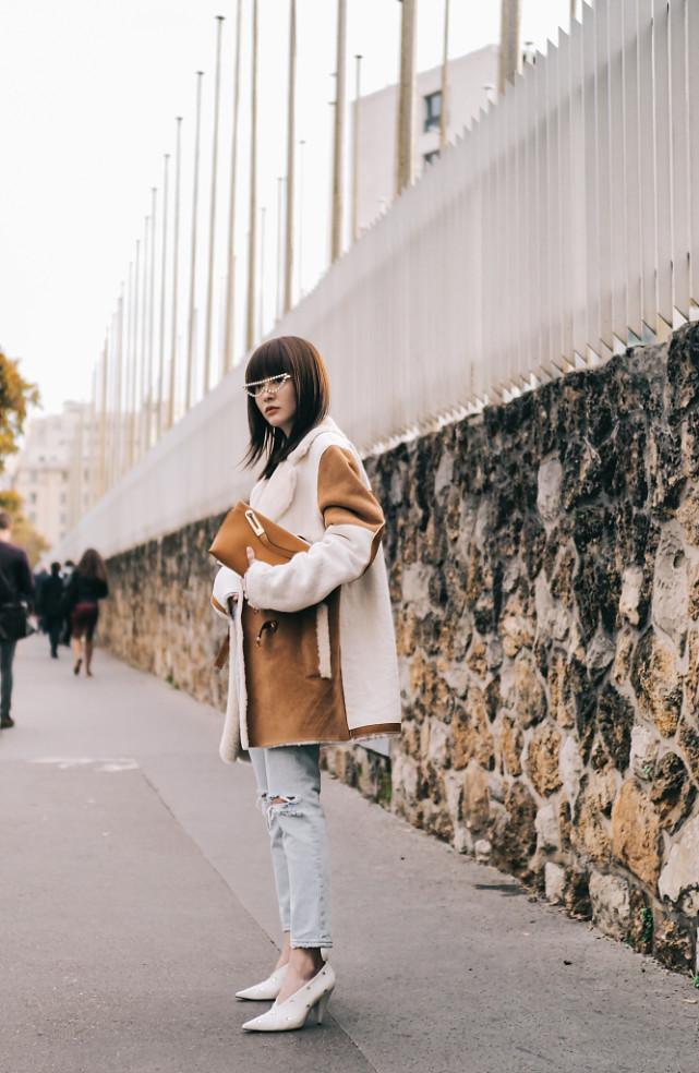 希望减龄效果更好的话,可以选择清新的蓝色。蓝色是冷色调的,文静又优雅,是比较文艺但不老气的颜色。将鹿皮绒搭配蓝色的服装,可以降低鹿皮绒的高级感,同时凸显出文静的少女气质。