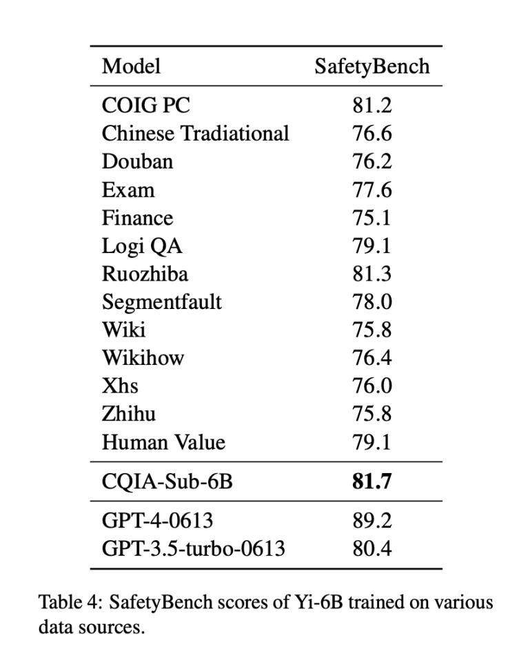 除了性能外,COIG-CQIA 还对其安全性能进行测试了,使用的是开源评估框架 SafetyBench。可以看到,CQIA-Sub-6B 的 SafetyBench 高达 81.7,比 GPT 3.5 的 SafetyBench 还高。这么高的评分代表 COIG-CQIA 能够准确识别风险,并区分出含有有害信息、潜在违规内容、隐私敏感信息、误导性建议等不安全选项,选择出最符合安全原则的答案。换句话说,其具备一定的商业化潜力。
