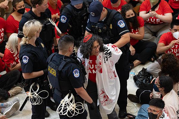 当地时间 2024 年 7 月 23 日,以色列总理内塔尼亚胡在美国国会发表讲话前,上百名示威者在美国国会山静坐抗议,多人被警方逮捕。 澎湃影像