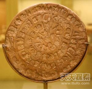 费斯托斯圆盘 是一个泥土圆盘,年代可追溯至公元前2000年左右。不过,它的来历、含义和用途至今仍是个谜。“费斯托斯圆盘”(亦译斐斯托斯圆盘或费斯托圆盘)发现于克里特岛,盘上共有241个印记表示45种不同符号,有些表示人物、动物、植物和工具。然而,由于未在历史同期发现过任何像这样的文物,考古学家无法对其内容做出有意义的分析。