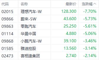截至发稿,理想汽车、蔚来 -SW ( 09866.HK ) 、零跑汽车 ( 09863.HK ) 、小鹏汽车 -W ( 09868.HK ) 分别下跌 7.70%、5.73%、5.61、3.46%。