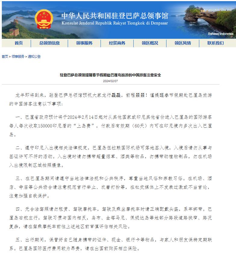 此前,2 月 7 日, 中 国驻登巴萨总领事馆曾提醒春节假期赴巴厘岛旅游的中国游客注意安全。除 " 无合法驾照请勿租赁、驾驶摩 托车 "" 在出国前购买相应保险 " 等内容外,还介绍了以下注意事项: