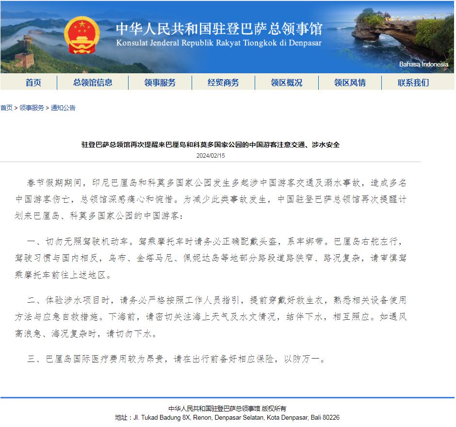 据中国驻登巴萨总领事馆 2 月 15 日消息,中国驻登巴萨总领馆发布公告称,春节假期期间,印尼巴厘岛和科莫多国家公园发生多起涉中国游客交通及溺水事故,造成多名中国游客伤亡,总领馆深感痛心和惋惜。